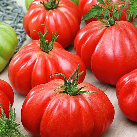 Аппетитные, привлекательные, насыщенно-розовые томаты-биф. Растения урожайные, компактные, быстро растут и завязывают плоды даже в жару и засуху. На каждой кисти вырастает по 5-6 крупных томатов оригинальной ребристой формы. Мякоть плотная, мясистая, разделена на многочисленные дольки, очень хорошего вкуса. Отлично выдерживают транспортировку и недолгое хранение. Растения устойчивы к большинству болезней, подходят для выращивания в закрытом грунте.