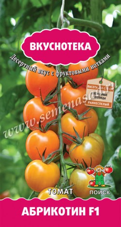 Необычная абрикосовая окраска и великолепный десертный вкус. Раннеспелый гибрид для пленочных теплиц. Период от всходов до начала плодоношения 95-100 дней. Растение индетерминантное, высотой 150-170 см, нуждается в подвязке, формировка в 1-2 стебля с удалением пасынков. Обильный, неприхотливый. Плоды округлые, гладкие, блестящие, массой 16-20 г, собраны в красивые компактные кисти по 12-14 штук. Окраска желто-оранжевая (абрикосовая). Вкус кисло-сладкий с фруктовыми нотками. Пригоден для уборки целыми кистями. Устойчив к вирусам, фузариозному увяданию, бурой пятнистости листьев.