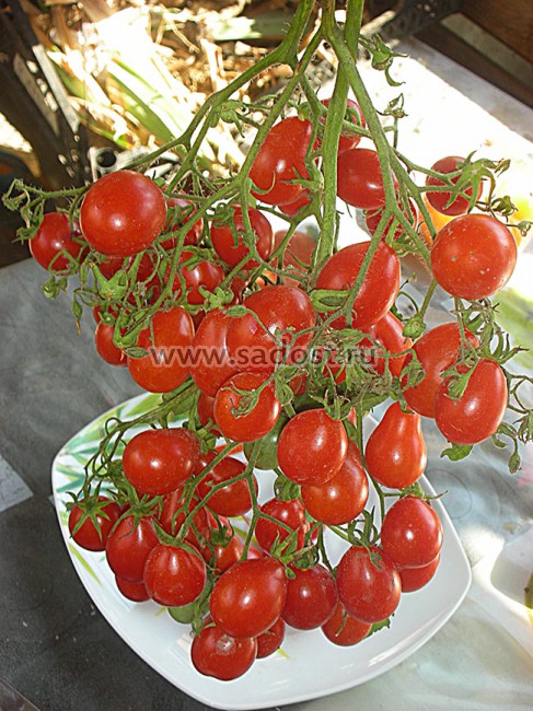 Индетерминантный, высокорослый (до 2х м.), раннеспелый, суперурожайный сорт. Рекомендован для теплиц и ОГ. У сорта сложная кисть с мелкими, сладкими, помидорками. В кисти может быть от 30 до 100 шт плодов. Высокорослый, с длительным плодоношением! Используется в свежем виде и для консервирования.