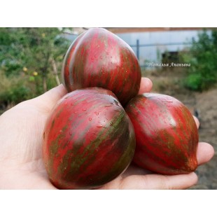 Новинка и супернаходка этого года!!! Детерминантный, штамбовый, высотой до 1 м, среднеспелый. Можно выращивать как в теплице, так и в открытом грунте. Лист простой, крупный, морщинистый. Плоды крупные, сердцевидные очень красивые, бордово-сиреневые снаружи с почти металлическими зелеными полосками и разводами. Внутри темно-вишневые, мясистые, с маслянистой мякотью, мягкий пряно-сладкий вкус. Шедевральный сорт!