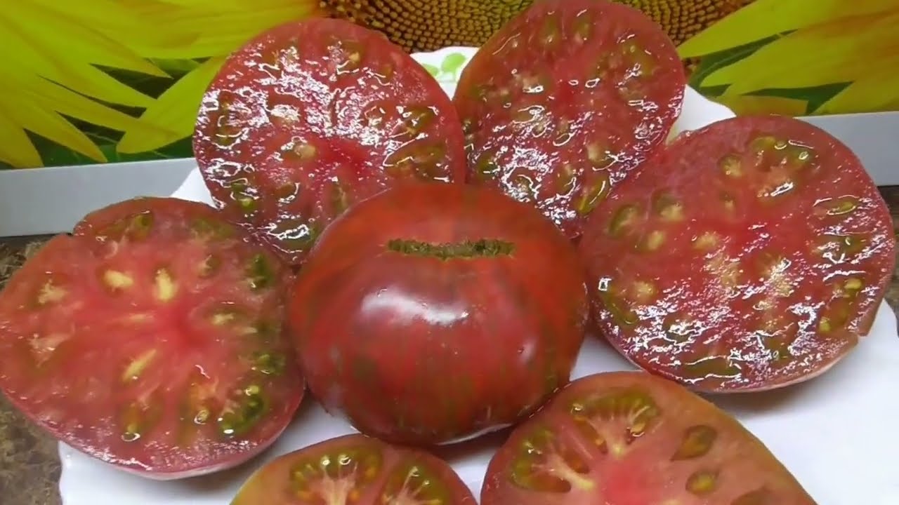 Высота куста до 1-1,2 м в открытом грунте, среднеспелый, лист морщинистый. Плоды крупные, плоско-округлые, с содержанием зелено-серебристых полос на красно-бордовом фоне. Масса плодов от 200 до 400 г. Мякоть плотная, мясистая, сочная, сбалансированного вкуса, с употреблением сахара и легкой кислинкой, с присущим ароматом. Урожайность высокая.