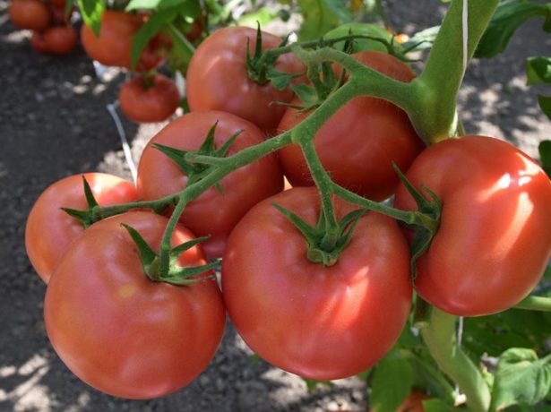 Помидоры собраны в кисти по 5–6 экземпляров. Они очень крупные: в среднем масса плода 250–300 г, а на самых нижних кистях — до 350 г. По форме плоды округлые, слегка приплюснутые. Окраска помидоров розовая, равномерная. Мякоть плотная, сочная, сладкая. Вкус считается хорошим. Семян мало, прожилки внутри не встречаются. Основное назначение — салатное, избыток урожая может быть переработан на сок, пасту, соусы, засолен в бочках: в стеклянные банки крупные помидоры в целом виде не помещаются.