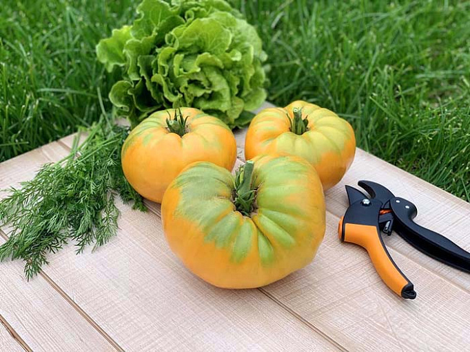 У огромных сочных помидоров цвета солнца вкус насыщенный, сладковатый, с медовыми нотками. Мы душой не кривим - это один из эталонных помидорных вкусов. Устоять невозможно! Плоды с прочной кожицей, не растрескиваются. Сорт среднеранний, индетерминантный, обладает крепким иммунитетом. Кусты высокие, густые, даже в непогоду дают обильные урожаи (до 6 кг с куста). Полив исключительно под корень. Формируем в 2-3 стебля.
