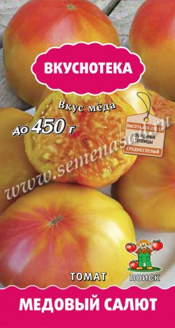 Насыщенный аромат, медовый вкус. Прекрасные двухцветные плоды отлично подходят для нарезки. Среднеспелый сорт для пленочных теплиц. Период от всходов до созревания 115-120 дней. Растение высокорослое, требует формирования и подвязки. Красивые, мясистые плоды плоскоокруглой формы, золотистого цвета с красными пятнами. Масса 320- 450 (до 800) г. Для употребления в свежем виде.