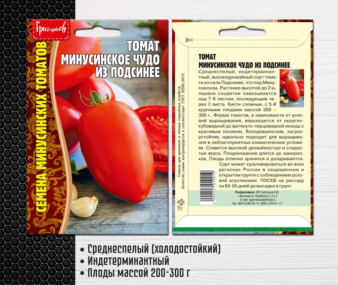 Среднеспелый, индетерминантный, высокоурожайный сорт томата из села Подсинее, что под Минусинском. Растение высотой до 2м, первое соцветие завязывается над 7-8 листом, последующие через 3 листа. Кисти сложные, с 5-6 крупными плодами массой 200 – 300 г.. Форма томатов, в зависимости от условий выращивания, варьируется от округло-кубовидной до вытянуто-перце видной иногда с красивым носиком. Холодовынослив, засухоустойчив, идеально подходит для выращивания в неблагоприятных климатических условиях. Славится высокой урожайностью и сладостью вкуса. Плодоношение длится до заморозков. Плоды отлично хранятся и дозариваются.