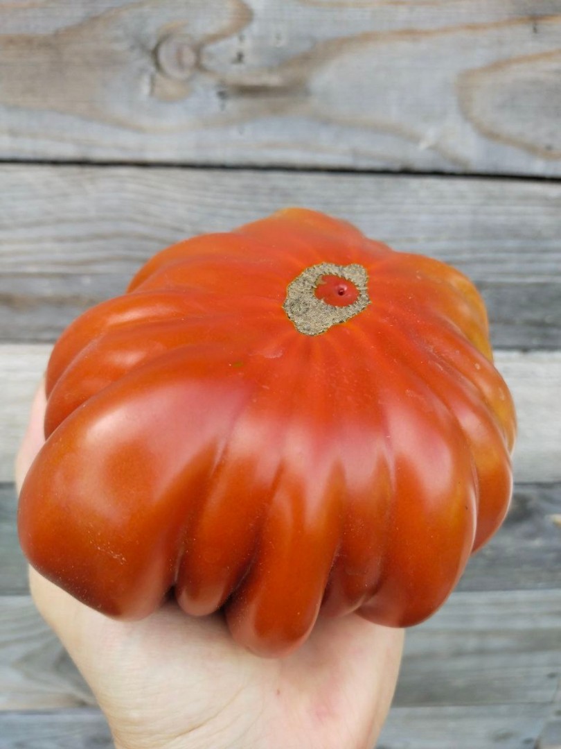 Индетерминантный (высокорослый), среднеспелый томат для выращивания в теплицах и под навесом. Очень декоративный, урожайный и вкусный сорт. Плоды необычной гофрированной формы, насыщенного кирпично-коричневого цвета, массой 300-600г. Мякоть сочная, мясистая, ароматная. Вкус интересный,сладкий с пряными оттенками. Не склонен к растрескиванию, неприхотливый.