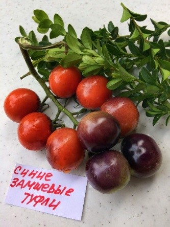 Среднеспелый, индетерминантный сорт. Плоды завязываются на красивых коротких кистях, на которых сидят плотно друг к другу, как бусины. Томаты круглые, красного цвета, с фиолетово-чёрным антоцианом на плечах, массой 30-40 гр. Мякоть сочная, мармеладная, ароматная.