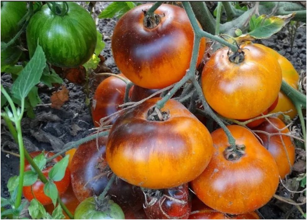 Плоды этого томата имеют необычные цвет и форму. Зрелый плод имеет оранжевый цвет с красным румянцем и макушкой, а также чернильные антоциановые плечики. На некоторых плодах могут присутствовать тонкие редкие фиолетовые полоски. Размер плода средний, его масса составляет от 120 до 220 граммов. Форма плода округлая или плоскокруглая. Каждая кисть может содержать до 8 плодов.