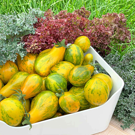 Не могут ни привлечь внимание огромные увесистые кисти с маленькими грушевидными арбузиками. Сладкие, нежные, сочные, с пряными нотками. Мякоть лаймового цвета, тает во рту. Шкурка тоненькая. Замечательно смотрится в нарезке. Сорт среднеспелый полудетерминантный. Кусты высокорослые. В одной кисти до 30 помидоров. Высокая урожайность независимо от условий выращивания. Формируем в 3-4 стебля.