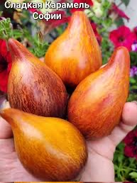Плоды в форме вытянутого сердца с носиком 150-300гр с очень красивым рисунком Желто- оранжевые с красными полосочками и хорошим антоцианом .Мякоть биколорная, вкуснейшая, невероятно сладкая.! Семян очень мало ! отличная урожайность.! Супер томат!!!