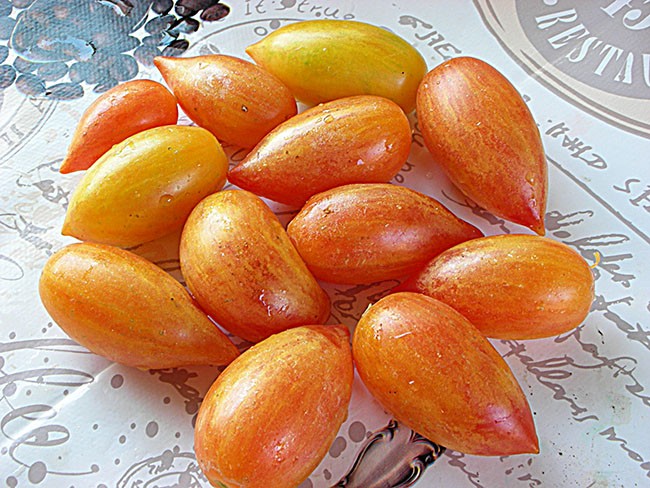 Очередной шедевр селекции Брэда Гейтса, США. Яркие, сочные, необычной формы, очень сладкие! Кистевой сорт с устойчивостью к перепадам температур. Сладкий крем - говорящее за себя название. Действительно очень сладкий, с небольшим количеством кислинки, которая делает вкус идеальным. Плоды - сливки с острым носиком, полосатые, очень блестящие, вначале кремовые, затем ярко желтые с красными полосами. Куст выглядит как фейерверк! Это очень высокорослый сорт - до 2м в теплице, среднеранний и очень урожайный. Выращивать в 2-3 ствола.