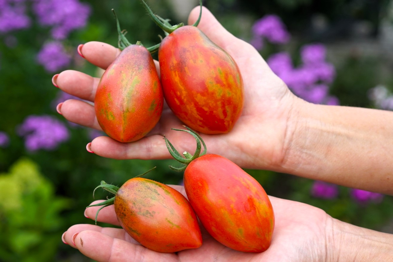 Индет, более 1,7 м. Среднеспелый. Плоды в форме груши. Масса 150-200 грамм. Цвет: красные с оранжевыми полосками и мазками анто. Вкус классический, старомодный со сладостью.