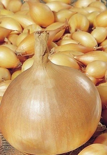Срок созревания. Лук Стурон полностью созревает за срок от 100 до 115 дней. В согласии с этим производитель отнес его к среднеспелым сортам. Так, его вполне могут с успехом выращивать жители северных регионов и средней полосы. Описание луковиц. Сорт Стурон представлен крупными корнеплодами, которые весят от 180 до 220 кг. Они имеют вытянутую форму, что, как видно из отзывов хозяек, очень удобно при нарезке. Шейка луковицы тонкая, донце небольшое. Верхние чешуйки плотные, желто-коричневые. Сочные чешуи ближе к центру корнеплода имеют зеленый оттенок. Вкус, применение. Лук Стурон возможно применять в любых блюдах и заготовках. Однако хозяйки не очень любят добавлять его в свежие салаты из-за резкого запаха и слишком горького вкуса.