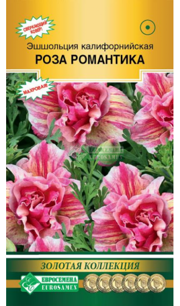 Эшшольция — травянистое растение семейства Маковых, завезено в нашу страну в середине 19 века из Калифорнии ботаником Иоганом Фрихрихом фон Эшшольц, и получившая, соответственно, свое название в честь его имени. Эшшольцию называют еще калифорнийским маком за внешнюю схожесть цветов. В садоводстве пользуется популярностью за счёт своей неприхотливости и обильного, продолжительного цветения. В естественной среде занимает собой целые поля и луга. В России культивируется в однолетней культуре, хотя на Родине считается многолетней. Это обладательница сильно рассеченных листьев на длинных черешках, богатой цветовой гаммы, причем как одного цвета, так и нескольких оттенков, махровых либо простых по форме цветков. «Роза Романтика» - уникальный сорт с густомахровыми цветками редкой, потрясающей окраски, поражающей воображение. Флористы и дизайнеры выбирают ее за легкий, ажурный вид и яркость окраски. Используется широко на клумбах для создания моно композиций, для создания бордюров, составления оригинальных букетов, а также в комплексном составе «мавританского газона». Высота растения-25 см Диаметр цветка-6-8 см