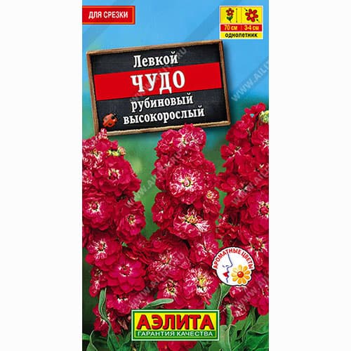 Левкой высокорослый Чудо рубиновый – элегантный душистый однолетник с винными махровыми цветами диаметром от 3 до 4 см. Высокорослые кусты (до 70 см) покрываются цветами с июля по август. Для оформления цветников в саду, можно выращивать сорт на срезку. Ароматные цветы идеально подходят для посадки на клумбах с пряными растениями. Сорт выращивается из семян, которые высаживают на рассаду в марте. С наступлением тепла посев семян можно проводить непосредственно в грунт. Источник: https://abekker.by/product/levkoy-vysokoroslyy-chudo-rubinovyy-semena