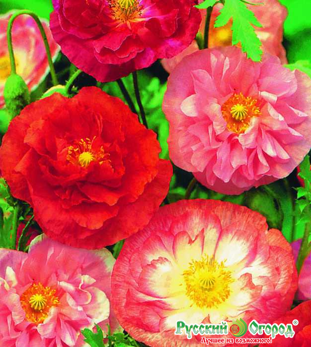 Мак самосейка Шелковый муар, смесь – красивая смесь однолетних садовых маков с двухцветными лепестками, идеальное сочетание цветков махровых и полумахровых. Гладкий зеленый газон приобретет вид райского уголка, если участок будет засажен этими красивыми, нежными цветами (дорастают в длину до 80 сантиметров).