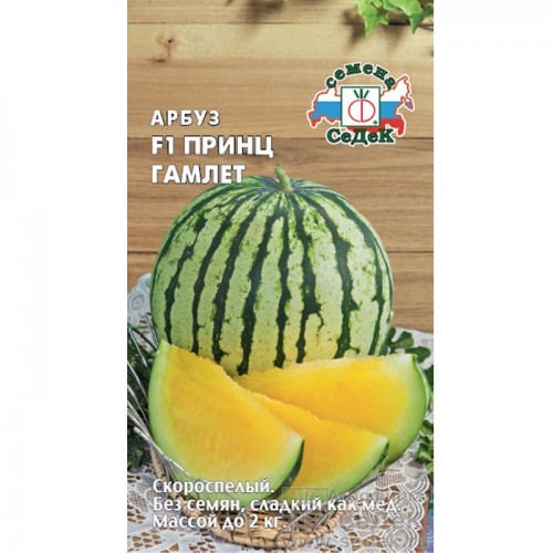 Арбузы серии «Принц» отличаются восхитительным вкусом и скороспелостью. Скороспелый (от всходов до созревания плодов 70-80 дней) гибрид для открытого и защищенного грунта. Подходит для выращивания в зонах неустойчивого земледелия даже в открытом грунте. Плоды округлые, зеленые с темно- зелеными полосами, не крупные, массой 1-2 кг. Кора тонкая. Мякоть совсем без семян, лимонно-желтая, очень сладкая, как мед. Урожайность с растения 4-6 кг. Ценность гибрида: неприхотливость выращивания, быстрая отдача урожая, высокий процент сахаристости, порционность плодов. Рекомендуется для употребления в свежем виде, приготовления цукатов и арбузного меда.