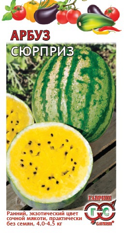 Арбузы с желтой мякотью редкие и дорогие гости на прилавках овощных магазинов, однако вырастить их из семян совсем несложно. Кубанские селекционеры создали арбуз Сюрприз, который прекрасно растет в средней полосе России (под пленочными укрытиями) и на юге. Сорт раннеспелый, это позволяет быстро формировать довольно крупные плоды массой 4,0-4,5 кг, даже если солнечных дней летом было мало. Мякоть ярко-желтая, практически не содержит семян, сладковатая, сочная. Кора тонкая, но на лежкости плодов это не отражается и после съема они прекрасно хранятся 2-3 месяца. Посев на рассаду производят в конце апреля. Высадку рассады в грунт — в конце мая – начале июня в возрасте 30-35 дней. Растения подвязывают к шпалере, до высоты 50 см удаляют все боковые побеги, последующие прищипывают над 1-3 листом или выращивают врасстил.