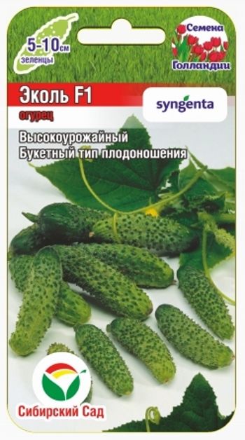 Новейший партенокарпичекий гибрид среднераннего срока созревания (45-48 дней) с интенсивной завязываемостью плодов и очень высокой урожайностью. Отлично растет и плодоносит в теплицах, пленочных укрытиях и в открытом грунте. В каждом плодоносящем узле формирует до 6-9 огурчиков, длиной от 5 до 10 см. Плоды короткие, цилиндрической формы, темно-зеленого цвета, среднебугорчатые, генетически без горечи, великолепно подходят для сбора зеленцов на пикули размером 4-5 см. Темно-зеленые, белошипые, сладкие зеленцы гибрида Эколь F1 хороши в свежем виде, по особому вкусны в засоле и при мариновании. Гибрид устойчив к кладоспориозу и мучнистой росе, относительно устойчив к вирусу огуречной мозаики.