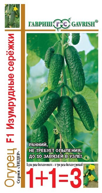 Скороспелый (42-47 дней от всходов до плодоношения) партенокарпический гибрид с букетным расположением завязей (8-10 в узле!) для выращивания в теплицах, под временными пленочными укрытиями и в открытом грунте. Растение сильнорослое, средневетвистое, женского типа цветения. Плоды цилиндрические, длиной 9-11 см, диаметром 3,0-4,0 см, массой 100-110 г, темно-зеленые, с частыми бугорками среднего размера, белошипые. Использование плодов универсальное. Гибрид отличается дружным плодоношением, высокой урожайностью (благодаря большому числу завязей в узлах на главном и боковых побегах), идеально подходит для сбора пикулей и корнишонов. Устойчив к настоящей мучнистой росе, оливковой пятнистости, относительно устойчив к ложной мучнистой росе, корневым гнилям и бактериозу. Урожайность 11-12 кг/м².
