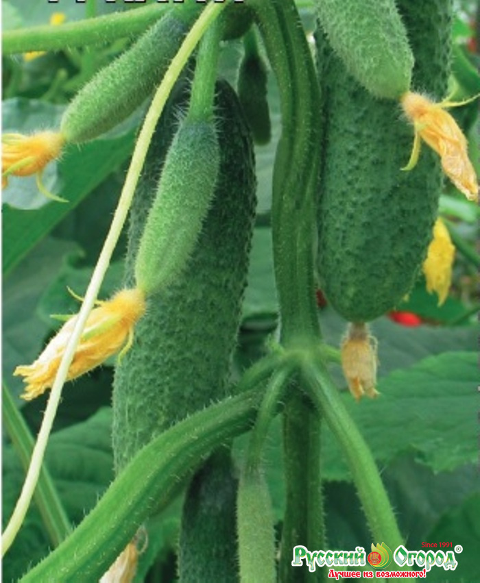 Среднеранний (40-45 дней) партенокарпический (не требует опыления) гибрид для открытого грунта и пленочных укрытий. Растение сильнорослое, среднеплетистое, с женским типом цветения и пучковым расположением завязей в узле. Зеленцы короткие, цилиндрические, часто- и мелкобугорчатые, темно-зеленые с короткими полосами, с белым опушением, с маленькими семенными камерами, длиной 10-11,5 см, массой 60-90 г, хрустящие, без пустот, без горечи. Урожайность до 25 кг/м². Ценность гибрида: комплексная устойчивость к болезням и к стрессовым условиям выращивания, стабильно дружное и обильное плодоношение, отличные товарные и технологические качества, подходит для длительной транспортировки. Рекомендуется для засолки и консервирования.
