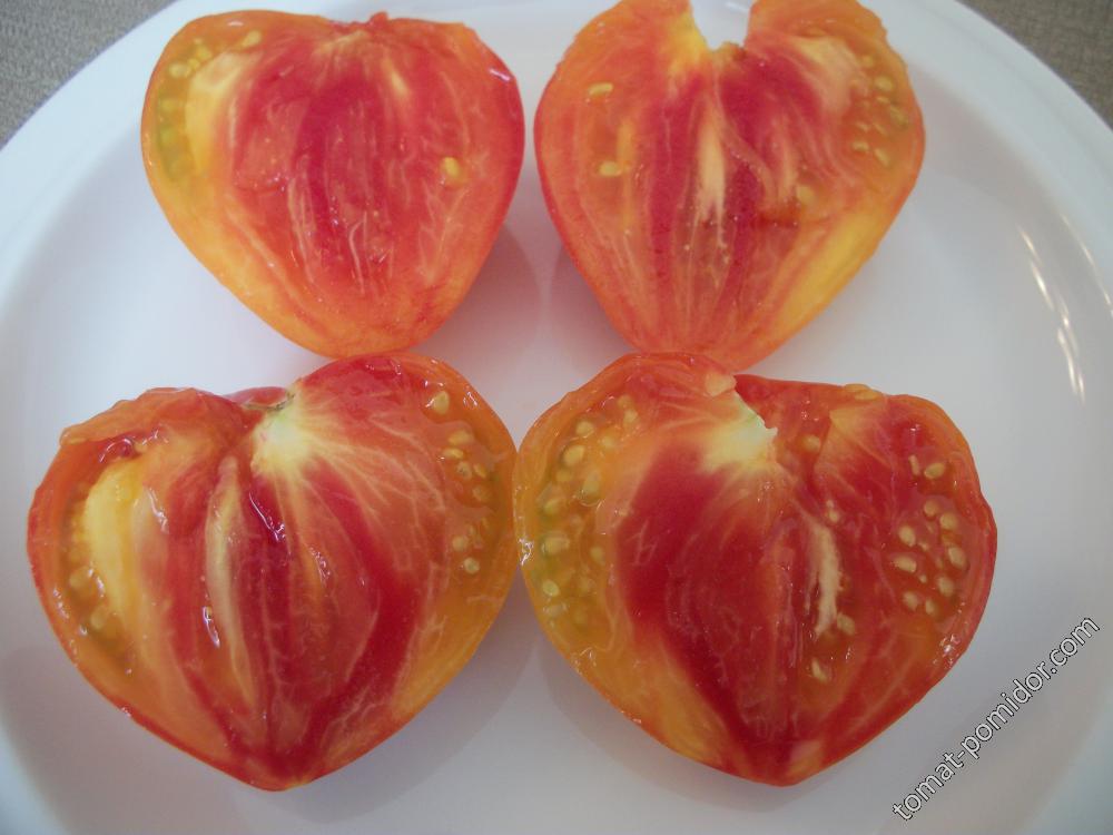 Сердце абрикосовой зебры – томат с таким оригинальным названием имеет и необычный вид. Вместо привычных круглых помидоров мы видим изящные, ярко выраженной формы сердца, немного вытянутые. Окраска тоже непривычная для пасленовой культуры – биколор: основной цвет абрикосово-жёлтый, и по нему красные полосы. А превосходный вкус с нежнейшей мякотью вообще напоминает какой-то экзотический фрукт, относя этот овощ к деликатесам.