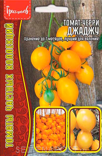 Томат черри Джаджу (yellow piennolo del vesuvio) - жёлтая разновидность Piennolo del Vesuvio называется по имени корсиканской девочки Джаджу. Среднеспелый, высокорослый до 180 см, формировка в 2-3 стебля. Картофельный лист. Плод желтый, сплюснутый и удлиненный, с острым носиком, массой 40-60 г., собраны в кисти. Плоды имеют толстую кожу, очень сладкий вкус при полном созревании, долго хранятся без потери качества и аромата. Для хранения снимают кисти, когда 70% плодов созрели и подвешивают в проветриваемом прохладном помещении. Этот сорт плодоносит до заморозков, довольно устойчив к фитофторе, прекрасно завязывается в жару. Для лучшего хранения следует ограничить полив. Вкус классический, ароматный. Во время хранения только усиливается, становится ярче. Малое содержание сока и семян делает его пригодным для термообработки. Вяленые томаты обладают прекрасным вкусом. Их можно замораживать, консервировать. Посев на рассаду в марте.