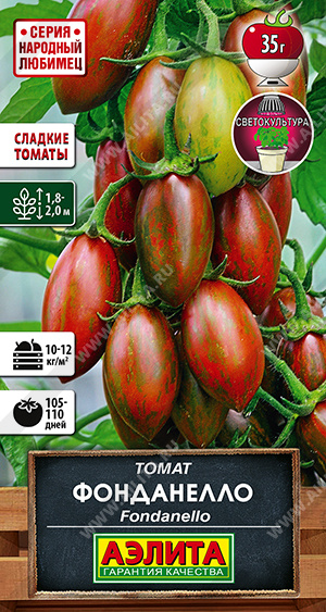 Очень сладкие томаты! Фонданелло становится фаворитом у всех, кто хоть раз его выращивали пробовал! Бесподобный сладкий вкус, оригинальная окраска и форма плодов – все это делает сорт поистине уникальным. Раннеспелый, от всходов до начала уборки 105-110 дней. Растения индетерминантные, высотой 1,8-2 м. Томаты* массой 30-35 г, собраны в кисти по 8-13 штук. Мякоть плодов глубокого красного, почти бордового цвета. Изумительный вкус плодов определяется высоким содержанием суммы сахаров, которая очень характерна для сортотипа Черри. Томаты сорта Фонданелло превосходно подходят для салатов, закусок и консервирования.