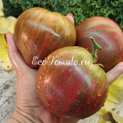 Детерминант, в теплице до 1 м. Среднеспелый. Помидоры типа бифштекс, масса 100-160 грамм, отдельные до 200 грамм, пряно-сладкий вкус. Яркие, цвета охры с полосками, в кистях 5-6 штук.