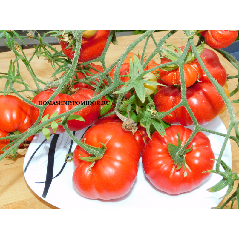 Cреднеранний, инд., высокорослый сорт. Интенсивный рост, здоровые и мощные растения. Мультифлорные огромные и потрясающие кисти, плоды очень мясистые, малосемянные, вкуснейшие плоды, очень сладкие. Потрясающее зрелище, должен быть в каждом огороде. Поэтапное созревание на кистях, когда плоды сорваны, на этой же кисти завязываются новые плоды. Очень красивый сорт, на фото одна кисть!!!
