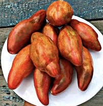 Индетерминантный, высокорослый (1,7-1,9 м), среднеспелый сорт. Плоды удлинённо-перцевидной формы с продольными рёбрами, бордового цвета , массой 120-250 гр. Мякоть густая, сочная, сплошное томатное “мясо”, сладко-пикантного вкуса, почти без семенных камер и семян.