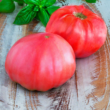 Вкуснейший гигант, наделенный сибирским здоровьем и выраженной сладостью тающей сахарной мякоти огромных помидоров до 15 см (!) в диаметре. Плоды малиновые округло-сердцевидные с ребристыми плечиками. Отлично хранятся. Куст индетерминантный, мощный с большими листьями. Сорт среднеспелый с обильной урожайностью. Формируем в 2 стебля. Пасынкуем как обычно.