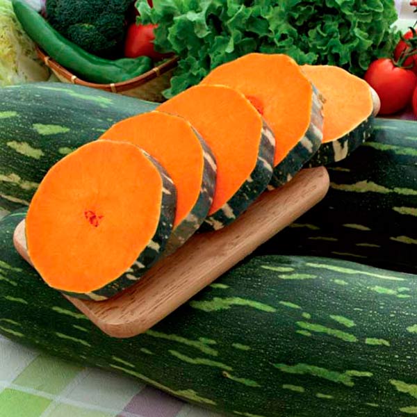 Обладательница уникальной цилиндрической формы. Несмотря на свой вытянутый стан, она приобретает значительные габариты: длину до 100 см и вес 18-20 кг. Ярко-оранжевая мякоть у плодов очень толстая, плотная, волокнистая, а семенная полость маленькая. Тыква невероятно сладкая, сахарная и вкусная. Кора гладкая и тонкая, выделяется особым «тигриным» окрасом: желто-оранжевые прожилки на серо-зеленом фоне. Отлично хранится.