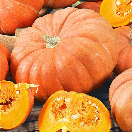 Шикарная среднеспелая прима-тыква, гордость огородной грядки. Плоды богатырские, ослепительно ярко-оранжевые, чалмовидные, мякоть такого же цвета, хрустящая, средней плотности, отличного вкуса. Прекрасно сохраняет товарность в течение 3 месяцев после съёма.