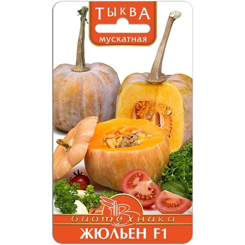 Тыква мускатная Жюльен F1 – столовый сорт раннего срока созревания, снимать плоды можно уже через 95 суток. Порционные плоды достигают весом до 1 кг. Мякоть отличается яркой мякотью и прекрасным вкусом.