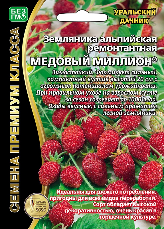 Разновидность земляника альпийская, ремонтантный нейтральнодневный сорт (плодоносит с июня вплоть до гибели цветов и завязей от осенних заморозков), безусый. Начинает плодоносить уже в первый год при выращивании из семян. К окончанию сезона кусты достигают размера 25-30 см в высоту и диаметр, хорошо облиствены (густые), количество цветоносов на куст в 2-3 летнем возрасте - 20-22, ягод на цветоносе - по 6-8 шт. Ягоды крупные, первые - до 10 г, последующие - по 7-8 г, удлиненно-овальные, красные, с выступающими семянками, легким сухим отрывом. Вкус и аромат просто волшебный, очень приятный, насыщенный, мякоть нежная, кисловато-сладкая. За счет обильного непрерывного цветения урожайность просто невероятная - до 700 г с куста, формируя за сезон до 1000 ягод. Это бесспорный лидер среди альпийских мелкоплодных сортов. Зимостойкость высокая.