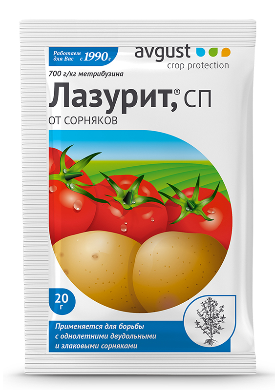 Его особенность в том, что он избирательно уничтожает только сорную растительность, не оказывая отрицательного воздействия на картофель. Первую обработку можно проводить сразу после посадки клубней, опрыскивая почву раствором препарата из расчета 10 г / 3 л воды. Этого объема хватает на 1 сотку. Обладая почвенной активностью, препарат поглощается преимущественно корнями, но может проникать и через листья. Именно это позволяет ему уничтожать не только вегетирующие сорняки, но и подавлять их проростки в почве, препятствуя появлению второй «волны» сорняков, даже таких злостных, как лебеда, марь, амброзия, бодяк, щирица и др. Обработку Лазуритом можно проводить и по проросшему картофелю, но при высоте ботвы до 5 см.