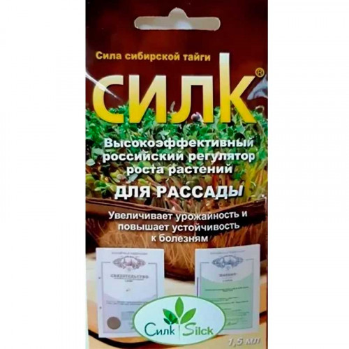 Высокоэффективный природный регулятор роста и индуктор иммунитета растений с фунгицидным эффектом к комплексу грибных, бактериальных и вирусных болезней, обладающий широким комплексом полезных свойств. Являясь, по сути, природным стимулятором роста и развития растений, обладающий мощными иммуностимулирующими и фунгицидными свойствами, СИЛК обеспечивает увеличение урожайности, морозоустойчивости и засухоустойчивости растений, стандартность и качество целевой продукции. Способ применения предельно прост и заключается в обработке наземной части растений в определённый для каждого из них вегетационный период водным раствором препарата. Препарат СИЛК представляет собой водную эмульсию, в состав которой входят экстракт хвои, прилипатель и иные биологические добавки. Природные соединения, входящие в состав СИЛКа, воздействуют на клеточное вещество растений, повышая сопротивляемость растений экстремальным условиям среды. СИЛК не токсичен, дозы его внесения очень экономичны микрограммы на растение. Применяется СИЛК путем опрыскивания зеленой массы растений (листья, цветки, завязи) и для замачивания семян и клубней. Биопрепарат СИЛК совместим с известными пестицидами, гербицидами, фунгицидами, инсектицидами. Видимое действие препарата на растение наблюдается через 1-2 дня в течение 1-2 недель после обработки. Системное воздействие СИЛКА приводит к существенному увеличению урожайности растений, уменьшаются потери при хранении, снижается уровень заболеваемости растений. СИЛК увеличивает всхожесть семян, количество цветков и завязей. Инструкция по применению СИЛК ВЭ 100 гл, на приусадебных участках. Силк используется на овощных, плодово-ягодных, зерновых, бахчевых и других с-х культурах, на цветах и комнатных растениях. 1. Для обработки одной (1) сотки томата, перца, капусты растворить 0,5 мл препарата в трех литрах воды (1 мл6л воды) и полученным рабочим раствором опрыскать зеленую массу растений в вечернее время в сухую погоду в фазе 5-7 листа или начала цветения (томата). Обработку повторять через 7 10 дней, не меняя дозы, и завершить за 15 дней до уборки урожая. Расход рабочего раствора 3л на 100 метров в квадрате на одну обработку. Для лука, чеснока, фасоли, картофеля и других корнеплодов дозу увеличить в два (2) раза, для огурцов, кабачков, патиссонов и иных бахчевых культур дозу уменьшить в два (2) раза. 2. Для плодово-ягодных культур провести две обработки осенью и две весной раствором 2-3 капли препарата на 200 мл воды на одну обработку (0,5мл2л воды). 3. Для обработки комнатных растений использовать в дозе одна капля на 30-40 мл на одну обработку (0,5мл1л воды). 4. Для луковичных одна ампула разводится в 100 мл воды (1 мл,1л воды). Луковицы растений опрыскиваются стандартным распылителем, сохнут одни сутки при комнатной температуре, затем высаживаются в грунт. 5. Для замачивания семян 0,5 мл3 л воды. Опрыскать семена из стандартного распылителя, дождаться высыхания и после этого высаживать в грунт (через 0 4 дня). Препарат практически не токсичен для пчел и других полезных насекомых. Класс опасности для пчел 3 (малоопасный). В состав Силк входит: Кора; Хвоя сибирской пихты; Тритерпеновые кислоты натурального происхождения; Биологические добавки. Благодаря хвое, входящей в состав, препарат имеет приятный запах. Он мгновенно растворяется в воде, удержив