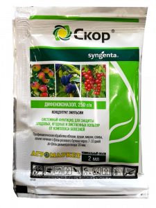 Скор поглощается растением и оказывает влияние на грибковый патоген при проникновении и образовании гаусторий. Он приостанавливает рост грибов, прекращая биосинтез стеролов в мембранах клеток. Не смотря на то, что характер действия дает возможность использовать препарат для лечения и профилактики, советуют осуществлять опрыскивание на начальной стадии, чтоб избежать потерь урожая и распространения инфекции.