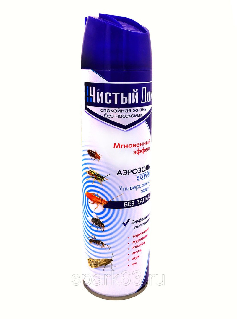 Эффективное и экономичное средство мгновенного действия для уничтожения всех видов летающих и ползающих насекомых: мухи, комары, мошки, моль, кожееды, осы, тараканы, постельные клопы, муравьи. Препарат не имеет запаха.